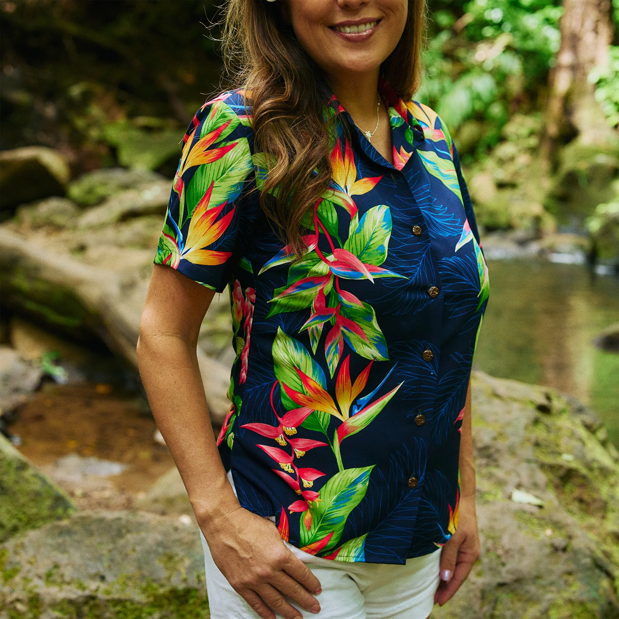 Our Bird of Paradise Camp Blouse captures a relaxed island vibe with every detail. Made in Hawaii from 100% rayon, it features authentic coconut buttons and a soft, smooth finish perfect for warm days. With its easy-care, wash-and-wear fabric, this blouse is as durable as it is stylish, bringing genuine Aloha spirit to your wardrobe.