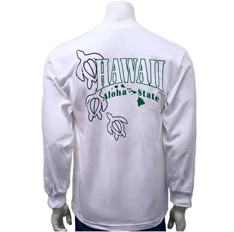 Embodying the essence of longevity, peace, humility, and inner spirit, the Honu, or Hawaiian sea turtle, serves as a profound symbol in Hawaiian culture. This 100% cotton T-shirt captures the island vibe, featuring "Hawaii Aloha State" along with the island chain and a Honu design.