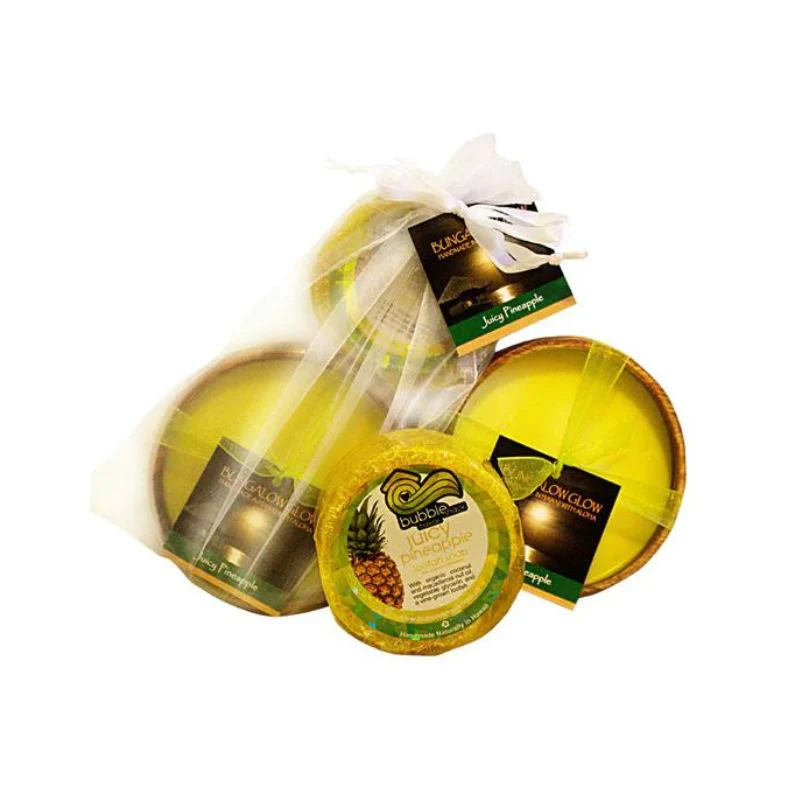 All natural, reef friendly, and hand made in Hawaii. This island inspired gift set includes one loofah soap and one soy poi candle in a gift bag.