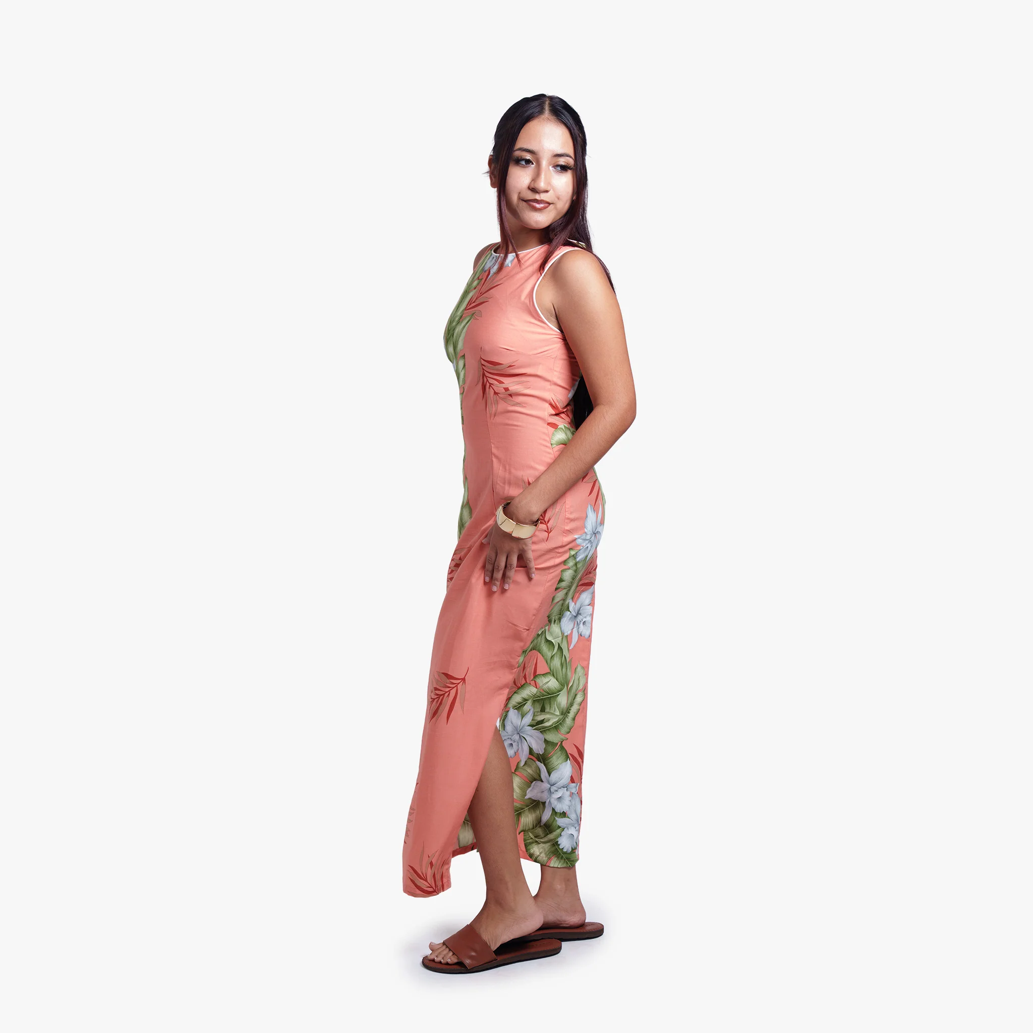 Graceful and refined, the Orchid Panel Piped Neck Long Dress is crafted from 100% rayon dobby for a soft, breathable feel. Designed with a slim silhouette, back zipper, and double side slits, it offers both elegance and ease—creating a flattering long-line look perfect for any special occasion.